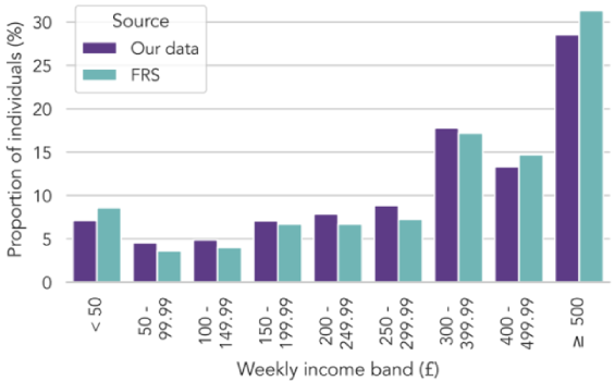 To illustrate the representativeness of their data, Smart Data Foundry provide several analyses, starting with a random sample from NWG for 1.2 million accounts with published national statistics from the ONS, DWP, and Family Resources Survey. We were able to demonstrate that the sample is relatively unbiased in terms of geographic and demographic coverage, income distribution, and representation of major customer groups, including recipients of state benefits and mortgagors (see Figures 6 and 7 for details).