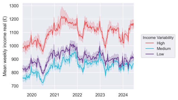 To extend the analysis beyond salaries, we examine additional sources of income. Figure 2 illustrates mean weekly income over time, disaggregated by income variability categories.