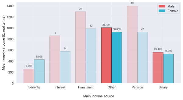 The upward shift in the y-axis confirms that other income streams contribute meaningfully to overall earnings. The SDF ‘Income Sources’ dataset allows us to examine total income patterns across groups of people classified by their main source of income (e.g. salary, benefits, or other). For example, Figure 3 shows the average weekly total income for the 30-34 age band, disaggregated by sex. The transparency of each bar represents the number of accounts for that group, i.e. the total number of observations. For reference, we also include the actual number of observations on top of each bar