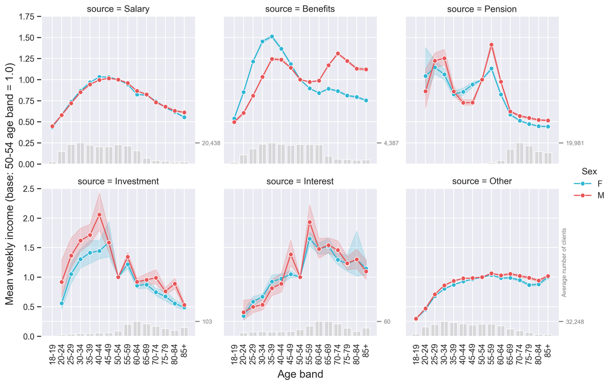 We can further investigate how mean weekly income evolves by age group for each category of main source of income. Figure 4 shows the relative growth of mean weekly income by age band for each group within our sample. We have set as base the values for 50-54 age band for reference. In addition, we include the average number of customers over time for each age band, which is reflected in the light grey bars at the bottom of each panel. For reference, we include the maximum number of clients for each main source of income category.