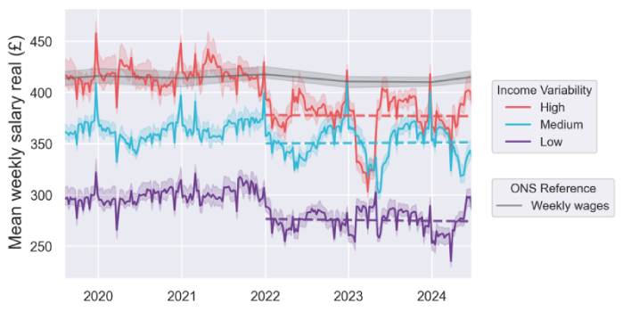 SDF provides an income variability measure that tracks changes in mean weekly income over a 13-week rolling window[1]. It categorises individuals into three groups: Low (<5%), Medium (5–15%), and High (>15%). Figure 1 shows the evolution of mean weekly salaries for these categories aggregated at postal area level[2]. For reference, the ONS median weekly wages at local authority level are shown in grey.